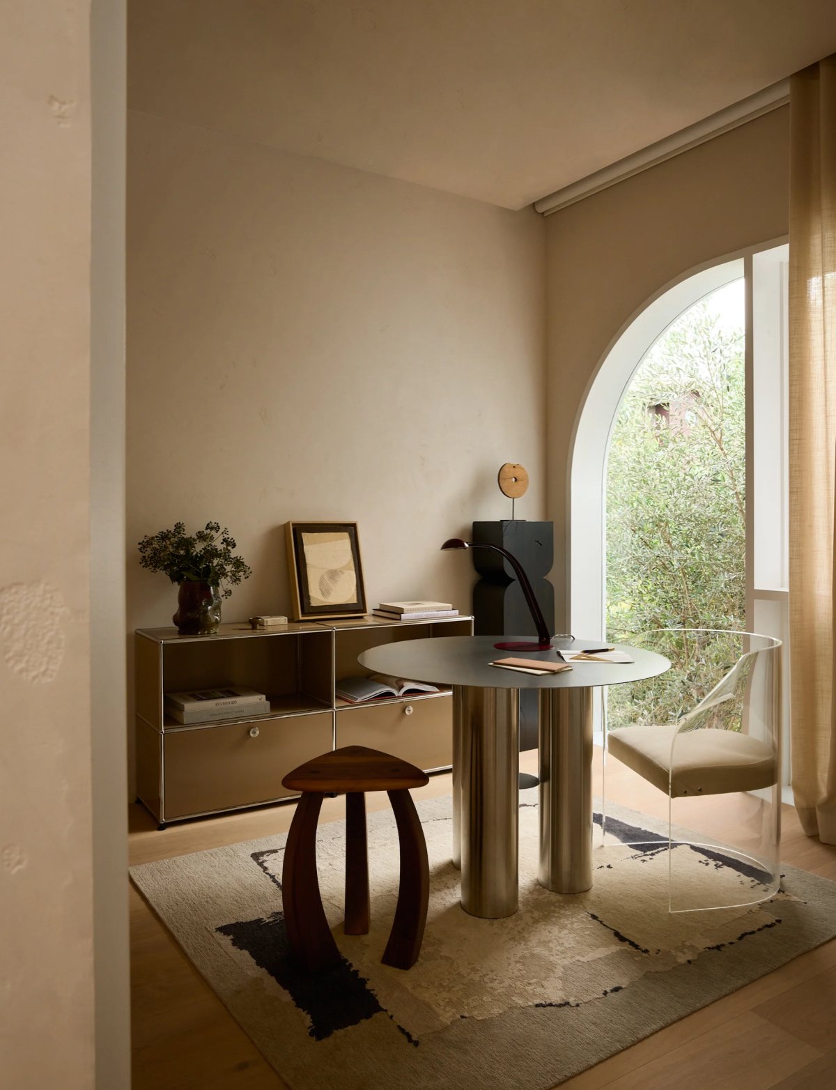 The interiors evoke serenity without austerity. Travertine floors and limewashed walls wrap each space in a tactile calm, while sculptural furnishings and warm metallic details add depth and distinction. The design feels collected, curated over time rather than styled for a moment.